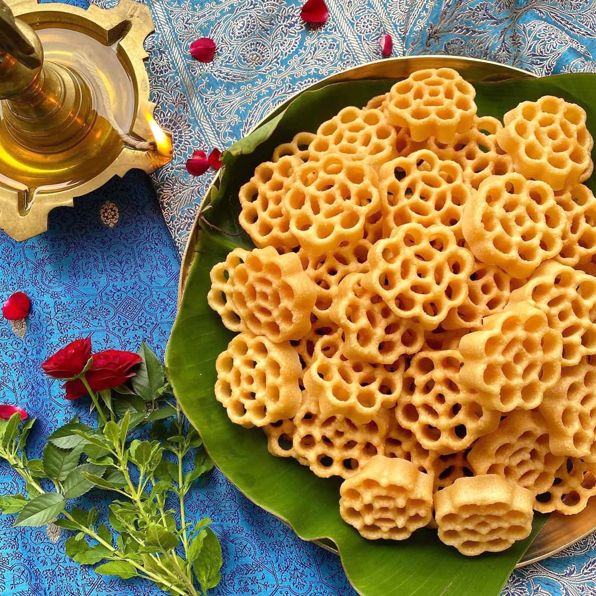 Achu murukku is also known as rose cookies or kuih loyang. This cookie is mildly sweet crispy murukku variety. These are deep fried cookies.